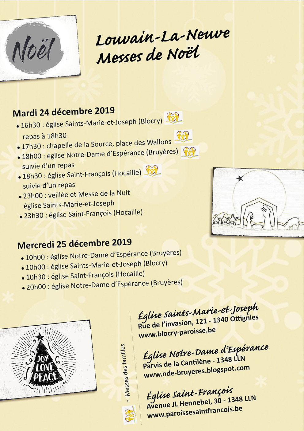 Vous pouvez déjà consulter les horaires des messes de Noël des trois paroisses de Louvain-la-Neuve, sur ce flyer NB: un ajout d'horaire par rapport à la version précédente,à Notre Dame d'Espérance